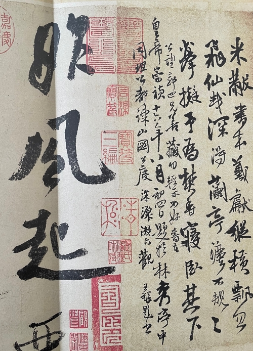 《吴江舟中诗》是米芾在吴江舟中为朱邦彦所书的一首五言古诗,凡44 行,每行字数不等。此卷小字如拳,大字似斗,狂放、率真、自由。作者用笔浓谈兼施,使转痛快从容,线条厚重酒脱,结体劲拔险峻,同时兼具“二王”的流畅隽美”。此作也印证了古人对米芾书法“风樯阵马,沉着痛快,当与钟、王并行”的赞美。