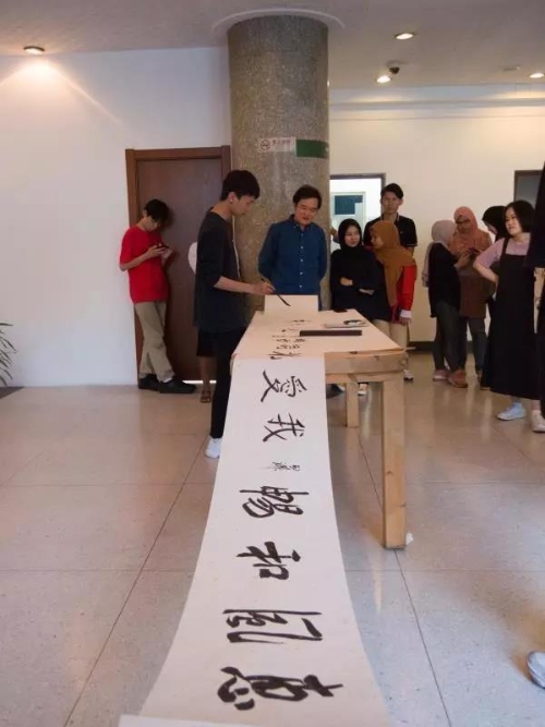 执行院长朱天曙教授来到活动现场,亲自指导留学生书法,之后中外师生共书翰墨长卷,院长崔希亮教授在长卷最后书写北语校训“德行言语 敦睦天下”,为本次活动划上一个圆满的句号。