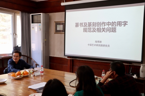 本次讲座的主题是“篆书及篆刻创作中的用字规范及相关问题”。陆明君研究员从“当下篆书及篆刻作品中所反映出的用字问题”谈及当代书法创作中普遍存在的用字错乱现象。讲座过程中,陆明君研究员还向同学们举出了部分书写失范的字例。他认为,书写者应该本着既尊重文字演变发展规律,又要顺应书法发展与时代结合的原则,做到“参古定法”和“以古为新”。