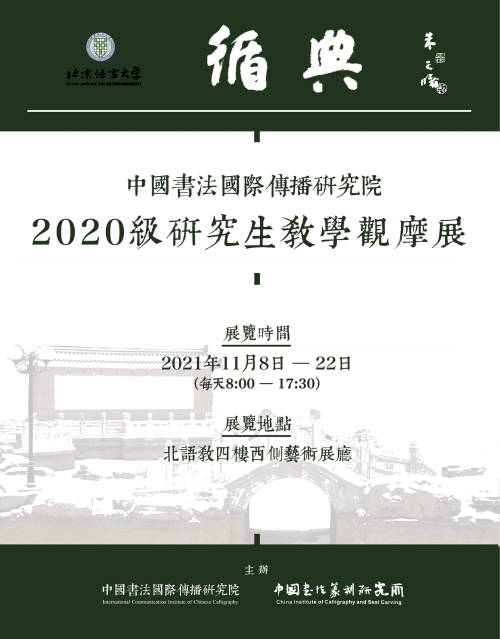 由中国书法国际传播研究院、中国书法篆刻研究所主办的循典——北语2020级书法专业研究生教学观摩作品展于十一月八日到十一月二十二日在北京语言大学艺术举行。朱天曙教授为本次展览题写展名。