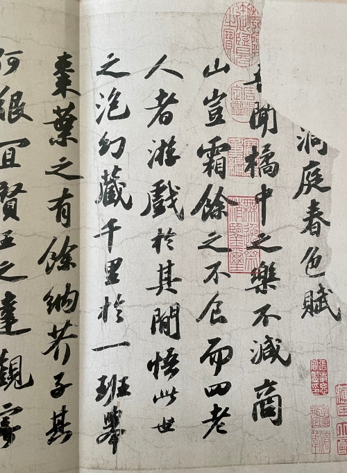 “二赋”字距紧密,行距虽宽,但因为结字宽扁横撑,布白谋篇显得满密严整。优美的文辞、平和的心境、熟练的技巧、饱满的墨色,使得整件作品点画凝重又从容潇洒;字形朴厚无华又舒卷自如,严整稳重之中略寓恣肆,尽显大度雍容之气,“书如其人”在这里得到了淋漓尽致的展现。明末清初精鉴赏、富收藏的张孝思云:“此二赋经营下笔,结构严整,郁屈瑰丽之气,回翔顿挫之姿,真如狮蹲虎踞。