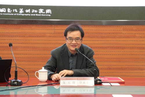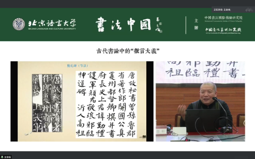 2020年11月23日下午,中国书法国际传播研究院的“书法中国”系列讲座第十四讲在北语逸夫教学楼第一会议室举行。讲座由荣宝斋书法院院长、荣宝斋《艺术品》期刊主编王登科教授主讲,中国书法国际传播研究院执行院长朱天曙教授主持。北京语言大学书法专业的本科、硕士、博士、专业课老师以及其他专业的学生参加了本次讲座。此次讲座设置了三个会场,分别是主会场第一会议室、分会场逸夫教学楼S201转播室和腾讯会议线上直播。